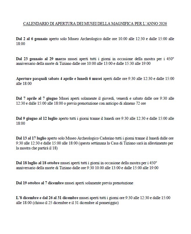 Per INFO dettagliate sui musei consultate le pagine dedicate alla Casa Natale di Tiziano e al MARC (Museo Archeologico Cadorino).