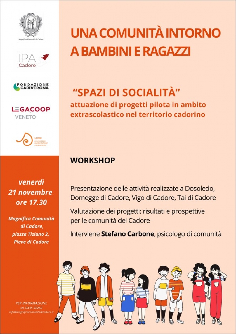 Abbiamo il piacere di invitare tutti gli interessati al workshop conclusivo del progetto: UNA COMUNITÀ INTORNO AI BAMBINI E AI RAGAZZI previsto per VENERDÌ 21 NOVEMBRE 2025 ALLE ORE 17.30 PRESSO LA SALA DELLA MAGNIFICA COMUNITÀ DI CADORE con il seguente programma: