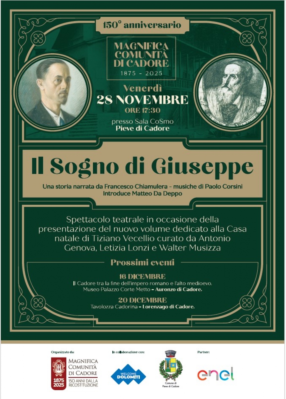 Alle ore 17.30 presso la sala CosMo si terrà la presentazione del nuovo volune dedicato alla Casa Natale di Tiziano, curato da Antonio Genova, Letizia Lonzi e Walter Musizza. L opera voluta dalla Magnifica Comunità di Cadore, ha ricevuto finanziamento di Enel. A seguire lo spettacolo "Il sogno di Giuseppe", il visionario Ingegnere che restaurò la Casa Natale di Tiziano nel 1927.