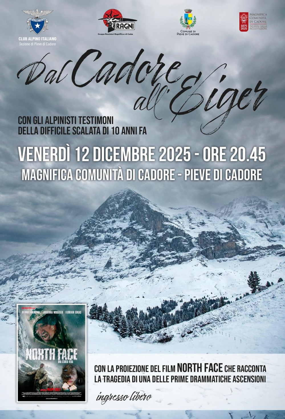 Venerdì 12 dicembre alle ore 20.30 nel Salone della Magnifica Comunità di Cadore il CAI di Pieve di Cadore organizza la setata Dal Cadore all Eiger. L evento prevende un incontro con gli alpinisti che parteciparono alla scalata della famosa parete nord 10 anni fa e a seguire la proiezione del film North Face, dedicato a una delle prime tragiche ascensioni.