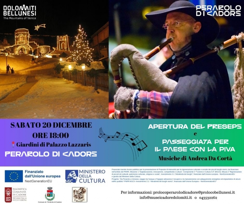 Perarolo di Cadore - sabato 20 dicembre 2025 - si svolgerà la tradizionale Apertura del presepe nei giardini Regina Margherita e a seguire la passeggiata per le vie del paese con la piva. Musiche di Andrea Da Cortà